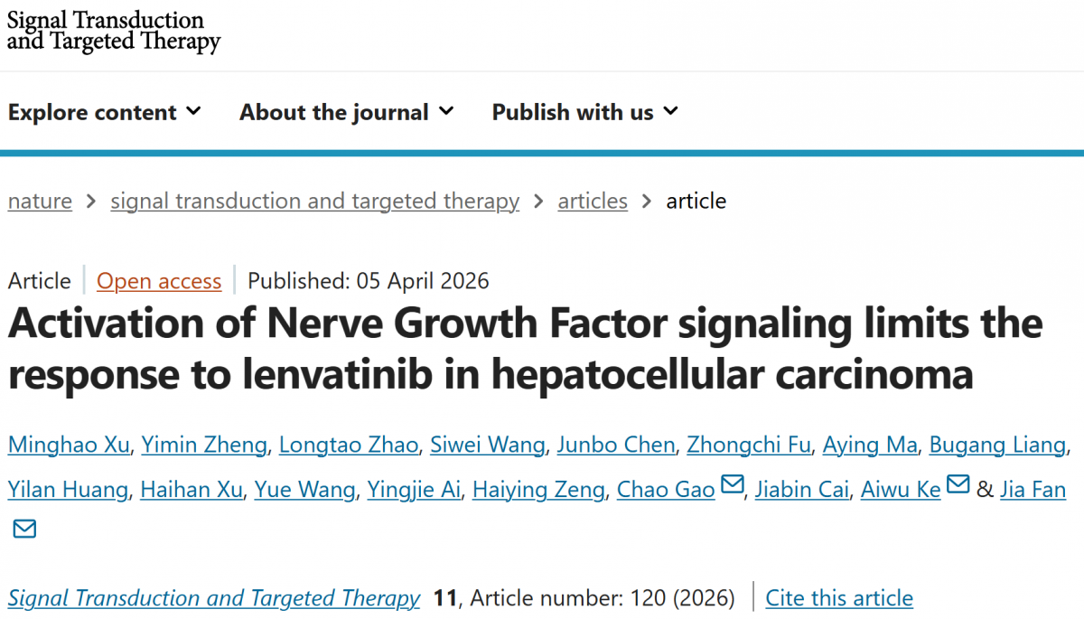 2026年4月5日,复旦大学樊嘉等团队合作在Signal Transduction and Targeted Therapy 在线发表题为“Activation of Nerve Growth Factor signaling limits the response to lenvatinib in hepatocellular carcinoma”的研究论文,该研究发现源自肝癌细胞的一种神经分泌因子——神经生长因子(NGF)是仑伐替尼耐药性的关键介质。
