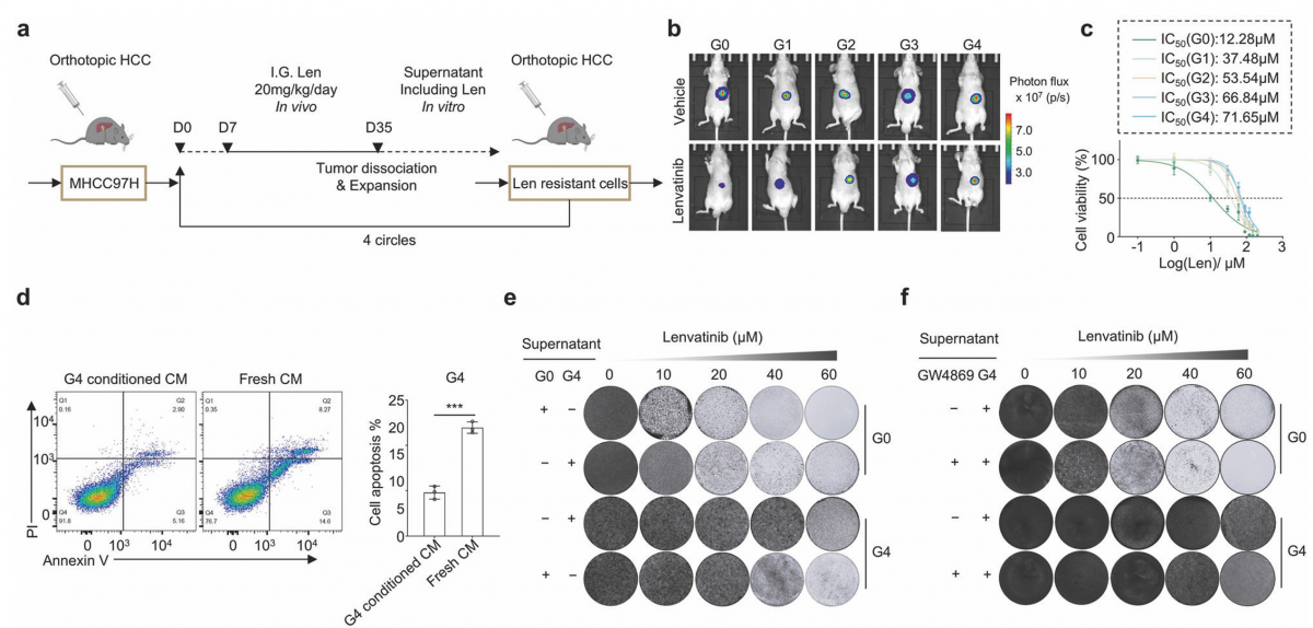 然而,尽管取得了这些进展,肝细胞癌患者的中位总生存期(mOS)并未显著改善,主要原因是产生了获得性耐药。耐药不仅降低了治疗效果,还可能加速肿瘤进展,最终导致更差的临床结果。因此,阐明仑伐替尼耐药的分子机制并开发有效的应对措施对于临床和公共卫生具有紧迫的重要性。已证实肝癌细胞中激酶通路的激活以及细胞系的转变会导致不同程度的仑伐替尼耐药性。然而,目前尚不清楚这种耐药性是否是通过肿瘤细胞自身的自分泌或旁分泌机制产生的。