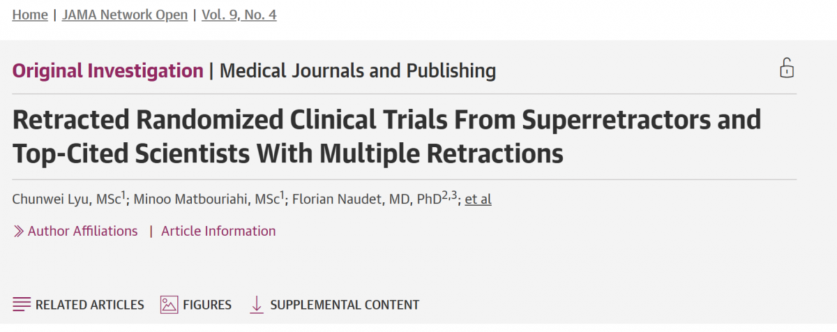 2026年4月15日,JAMA Network Open(懂的都懂,医学顶流期刊)发表一项系统性研究,揭示全球被撤稿随机对照试验(RCT,简单说就是最靠谱的临床实验论文)的惊人真相 ——6 位 “超级撤稿者” 共著 290 篇被撤稿 RCT,占全球 1330 篇撤稿 RCT 的 22%。其中 5 人集中在麻醉科与内分泌代谢专业,这些假论文平均流通 14 年才被撤回,持续污染证据生态系统。