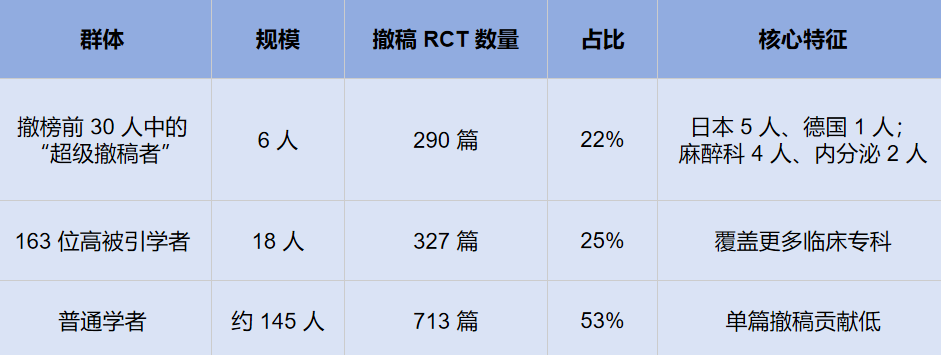 这项由意大利帕多瓦大学、法国雷恩大学与美国斯坦福大学联合完成的研究,以 VITALITY 队列(截至 2024 年 11 月全球 1330 篇被撤稿 RCT 数据库)为基础,交叉比对 “撤稿观察”(Retraction Watch)前 30 名、163 位高被引学者(累计撤稿超 10 篇)及 174 位高被引学者名单。