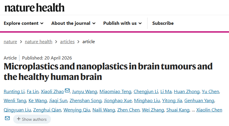 2026年4月20日,首都医科大学、中国医学科学院、中国环境科学研究院等团队在" Nature Health "期刊上发表了一篇题为" Microplastics and nanoplastics in brain tumours and the healthy human brain "的研究论文。